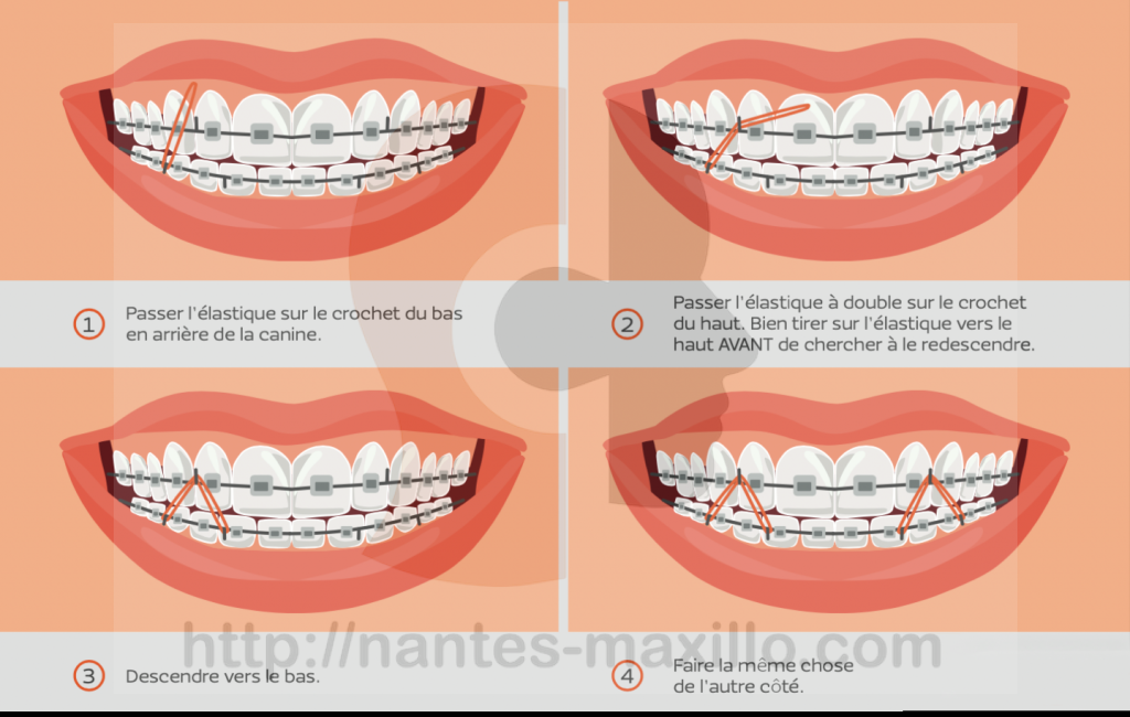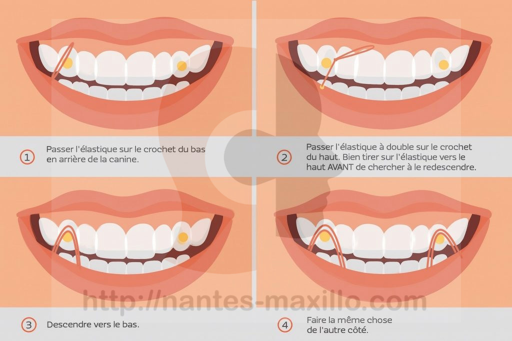En résumé, pour faire simple, les premières semaines, on positionne les élastiques au niveau des canines. en V inversé, en partant du bas, en double en haut, puis en terminant devant.