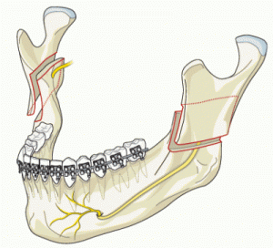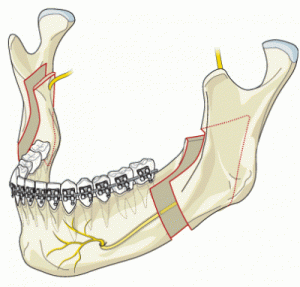 L’ostéotomie de la mandibule (mâchoire inférieure) est une intervention courante dans la chirurgie des dysmorphoses dentofaciales, y compris pour les dysmorphoses de faible importance. Elle vise à avancer ou reculer la mandibule pour l’accorder avec l’arcade antagoniste (elle vise à faire grandir ou diminuer la mâchoire inférieure pour l’accorder avec la machoire opposée).